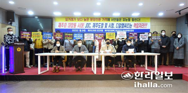 제주첨단꿈에그린 3단지 임차인 비상대책위원회가 24일 제주도의회 도민카페에서 기자회견을 열고 "시세 80~85% 수준의 분양 전환가 약속을 이행하라"고 요구했다. 김도영기자