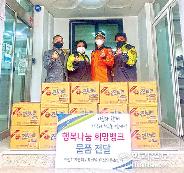 표선119센터 남·여성의용소방대(대장 강상부·고봉숙)는 지난 21일 지역 내 어려운 이웃에게 전달해 달라며 행복나눔 희망뱅크에 라면 15박스(40만원 상당)를 기탁했다.