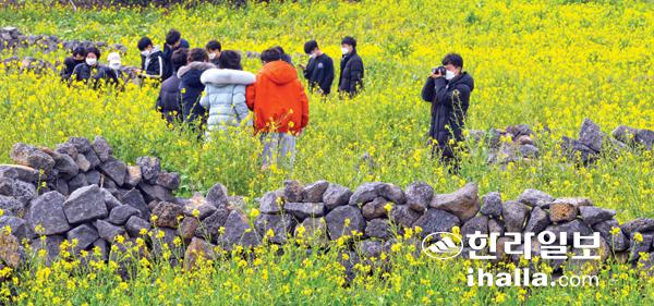 24일 성산일출봉 인근 유채밭을 찾은 관광객들이 유채꽃이 활짝 핀 제주의 겨울정취를 만끽하고 있다. 강희만기자