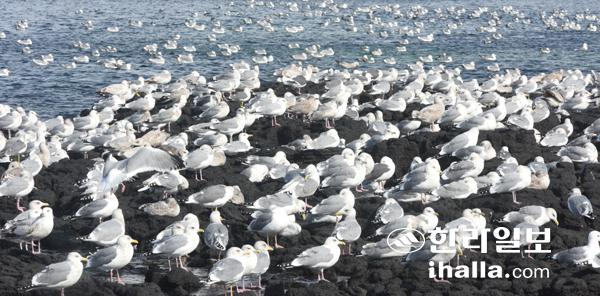 24일 제주시 한림읍 갯바위에서 갈매기떼가 휴식을 취하고 있다. 이상국기자