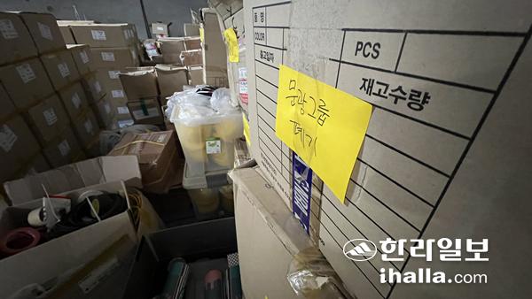 물품 보관소 내부를 살펴보니 제주관광공사가 제작한 홍보물이 담긴 박스가 발디딜틈 없이 쌓여져 있었고 대부분 코로나19 사태 이전에 제작된 것이었다. 내용물은 제주도 푸른밤 리플릿, 크루즈가이드맵, 특수어권 포켓북, 제주관광특화 홍보물 관광지도 등 이었다. 창고 벽면에는 제주관광홍보물 재고 관리표가 붙여져 있었는데 해당 보관소에는 총 900여개의 홍보물 박스가 보관돼 있는 것으로 기록됐다.