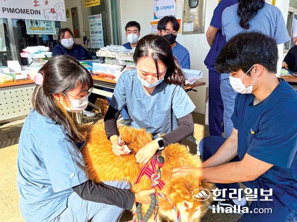 제주대학교 수의과대학(학장 손원근)은 지난해 11월 20일 제주시 한경면 저지리, 12월 18일 서귀포시 안덕면사무소에 이어 이달 22일엔 제주시 아라동 주공아파트에서 동물 무료진료 봉사활동을 벌였다.