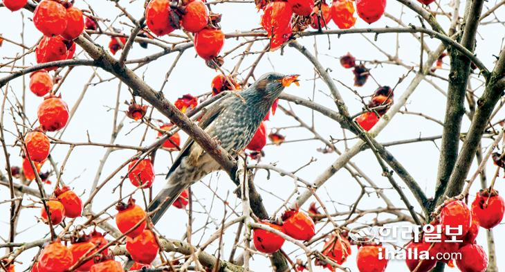 26일 서귀포시 성산읍 수산리 한 가정집 정원 감나무에 직박구리가 찾아와 홍시로 만찬을 즐기고 있다. 강희만기자