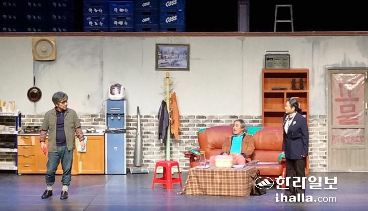 이번 무대는 제주도문화예술진흥원의 새해 첫 기획 공연으로 마련됐다. 지난 연말 한라아트홀 소극장에 15회에 걸쳐 올렸던 제주 극단 가람의 '언덕을 넘어서 가자'를 초청해 이날 오후 4시와 7시 두 차례 무료 공연했다.