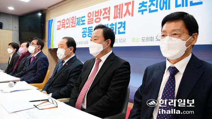 3일 교육의원제도 폐지 반대 회견하는 교육의원 입후보 예정자들. 강희만기자