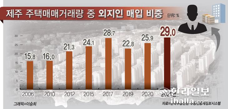 도내 주택매매거래량 중 외지인 매입 비율은 2006년만 해도 15.8%(3699호 중 585호) 수준이었다. 외지인 비중이 처음 20%를 넘긴 것은 제주이주 바람이 막 불기 시작하던 2012년으로 21.3%(9166호 중 1950호)에 달했다. 그 후에도 지속적으로 외지인의 도내 주택 매입이 확대되며 2017년엔 28.7%(9261호 중 2654호)로 최고치를 기록한 적이 있다. 제주이주 열기와 부동산 호황세가 한풀 꺾이며 ▷2018년 24.9%(9423호 중 2344호) ▷2019년 22.8%(7993호 중 1824호) ▷2020년 25.9%(1만409호 중 2693호)로 잠시 주춤거리는가 싶더니 작년엔 다시 외지인 매입비중이 역대 최고치를 갈아치웠다.