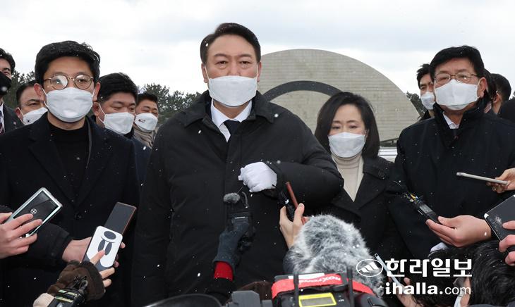 국민의힘 윤석열 대선 후보가 5일 제주시 제주4.3평화공원을 참배한 후 취재진 질문에 답하고 있다. 연합뉴스