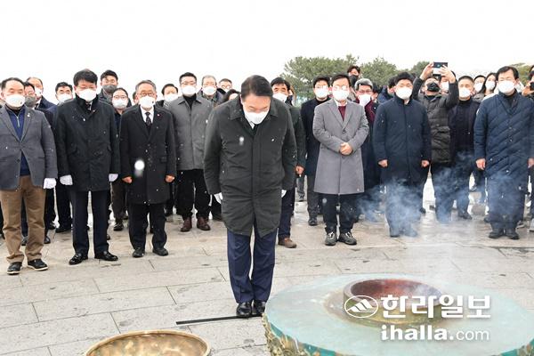 윤석열 국민의힘 후보가 5일 제주시 봉개동 소재 제주4·3평화공원을 찾았다. 강희만기자
