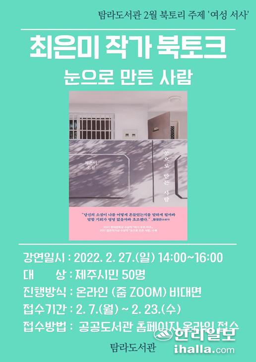 매월 주제를 정해 북토리(Booktory) 프로그램을 운영하는 제주시 탐라도서관이 2월에는 '여성 서사'를 주제로 최은미 소설집 '눈으로 만든 사람'으로 온라인 북토크를 진행한다.