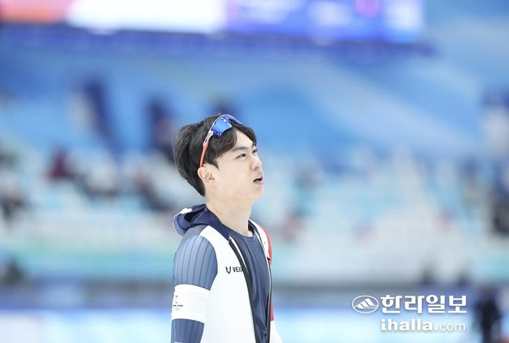 김민석이 8일 오후 중국 베이징 국립 스피드스케이팅 경기장(오벌)에서 열린 2022 베이징 동계올림픽 스피드스케이팅 남자 1500m 경기를 마친 후 숨을 고르고 있다. 연합뉴스