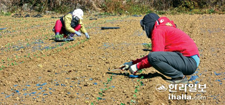 8일 제주시 한경면 한 밭에서 지역 농민들이 봄 브로콜리 파종 작업으로 분주하다. 이상국기자