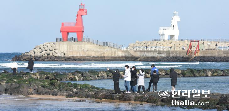 8일 제주시 이호테우해수욕장을 찾은 관광객들이 원담을 걸으며 겨울 바다를 만끽하고 있다. 이상국기자