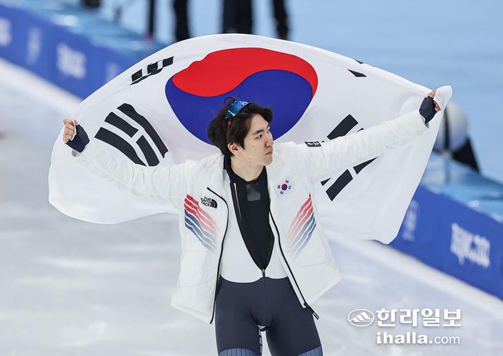 한국의 차민규가 12일 오후 중국 베이징 국립 스피드스케이팅 경기장(오벌)에서 열린 2022 베이징 동계올림픽 스피드스케이팅 남자 500m 경기 2위로 은메달을 획득한 뒤 태극기를 들고 경기장을 돌고 있다. 연합뉴스