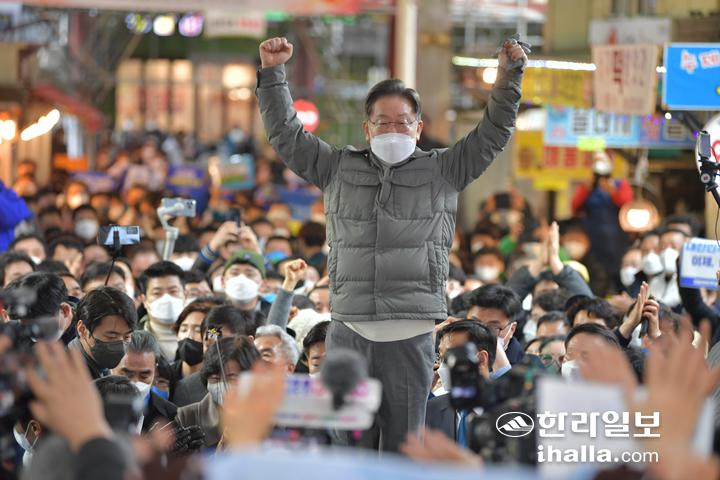 13일 서귀포매일올레시장을 찾은 더불어민주당 이재명 대통령 선거 후보가 두 손을 들어 지지자들의 성원에 화답하고 있다. 강희만 기자
