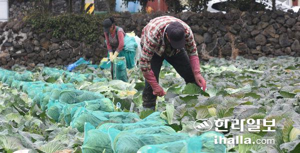 13일 제주시 한림읍 한 밭에서 농민들이 양배추 수확으로 분주한 시간을 보내고 있다. 이상국기자