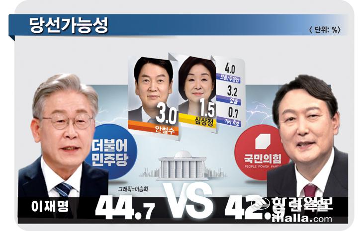 ▶당선 가능성·정당 지지도=당선 가능성 조사에서도 박빙 양상을 보였다. '지지 여부와 상관 없이 차기 대통령으로 당선 가능성이 가장 높다고 생각하는 후보가 누구인지'를 물은 결과 이재명 후보가 44.7%, 윤석열 후보가 42.9%로 조사돼 두 후보간 격차가 오차 범위 안에서 머무른 것으로 나타났다. 이어 안철수 후보(3.0%), 심상정 후보(1.5%), 기타 후보(0.7%) 순으로 집계됐다. 이밖에 '없음' 3.2%, '모름·무응답' 4.0%로 각각 조사됐다.