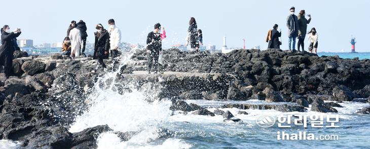 14일 제주시 애월읍 곽지해수욕장을 찾은 관광객들이 겨울 바다를 구경하고 있다. 이상국기자