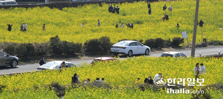 15일 서귀포시 안덕면 사계리 유채밭을 찾은 관광객들이 제주의 겨울을 즐기고 있다. 강희만기자