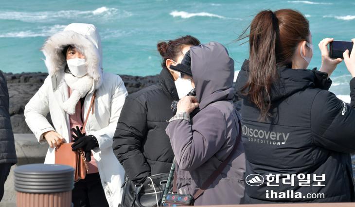 바람이 불며 체감기온이 뚝 떨어진 15일 제주를 찾은 관광객들이 몸을 잔뜩 움츠리고 있다. 강희만기자