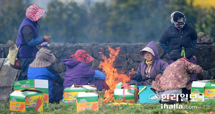 강추위가 찾아온 16일 제주시 구좌읍 종달리 한 농경지에서 어르신들이 모닥불을 피워 언몸을 녹이고 있다. 강희만기자
