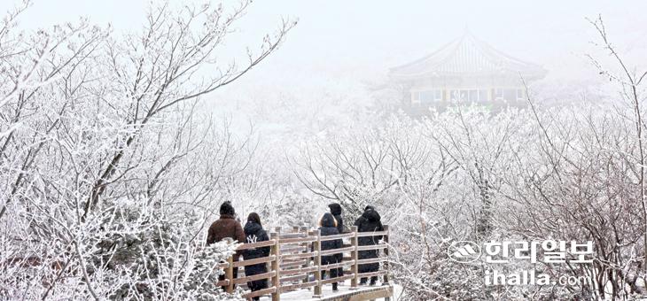 16일 한라산 1100고지 습지에 눈이 내리는 가운데 관광객들이 아름다운 상고대를 배경으로 기념사진을 찍고 있다. 이상국기자