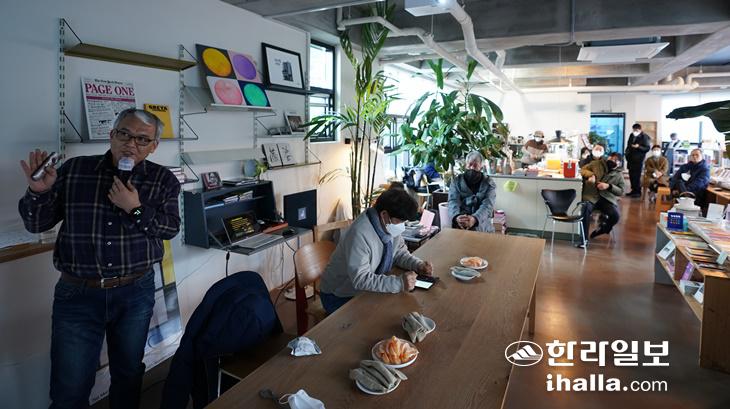 강시영 원장이 19일 서귀포시 소재 동네책방 인터뷰에서 가진 북콘서트에서 "매년 밭담. 지질공원, 음식 등 제주 소재로 한 책 두권씩을 내겠다"고 말하고 있다. 사진=강경민 작가