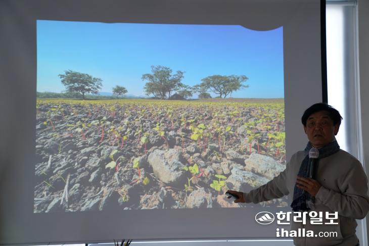 김찬수 박사가 척박한 제주 환경에서도 제주사람들처럼 강인하게 자라는 제주 메밀에 대한 이야기를 들려주고 있다. 사진=강경민 작가