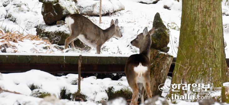 20일 제주시 봉개동 절물자연휴양림에 노루 두마리가 눈밭을 돌아다니며 먹이를 찾고있다. 이상국기자