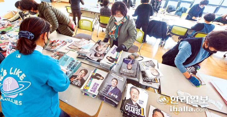 21일 서귀포시 중문동주민센터에서 제20대 대통령선거 책자형 선거공보물 발송작업이 진행되고 있다. 이상국기자
