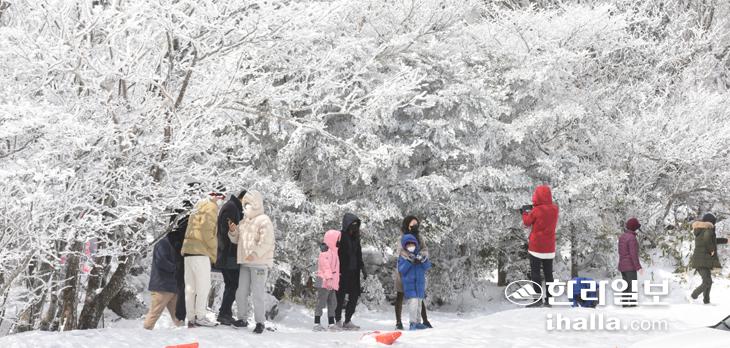 22일 1100고지를 찾은 관광객들이 하얀 눈 세상으로 변한 주변 경관을 배경으로 기념사진을 찍고 있다. 이상국기자
