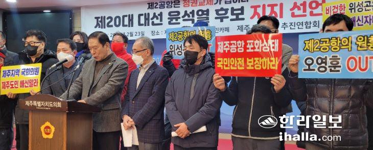 제주 제2공항 추진연합회 관계자들이 23일 기자회견을 열고 국민의힘 윤석열 대선 후보 지지를 선언하고 있다. 김도영기자