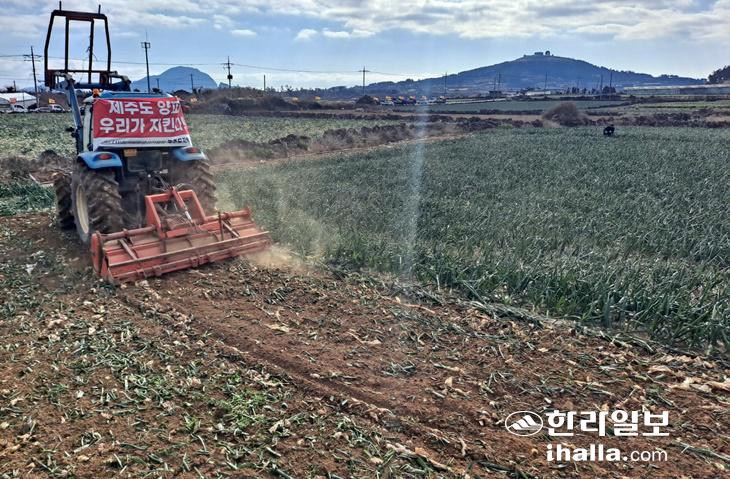 24일 서귀포시 대정읍 동일리의 한 밭에서 농민들이 가격 하락에 따른 정부 대책을 요구하며 트랙터를 투입, 내달 수확을 앞둔 양파를 갈아엎고 있다.