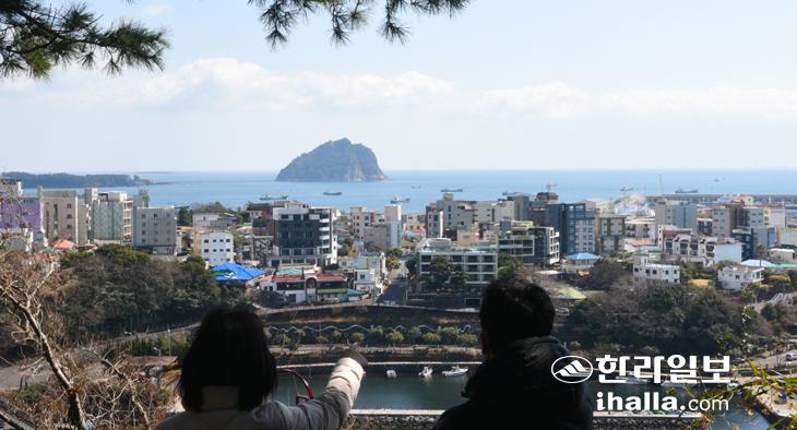 24일 서귀포 칠십리시공원 새섬전망대를 찾은 시민들이 서귀포 바다의 절경을 바라보고 있다. 이상국기자