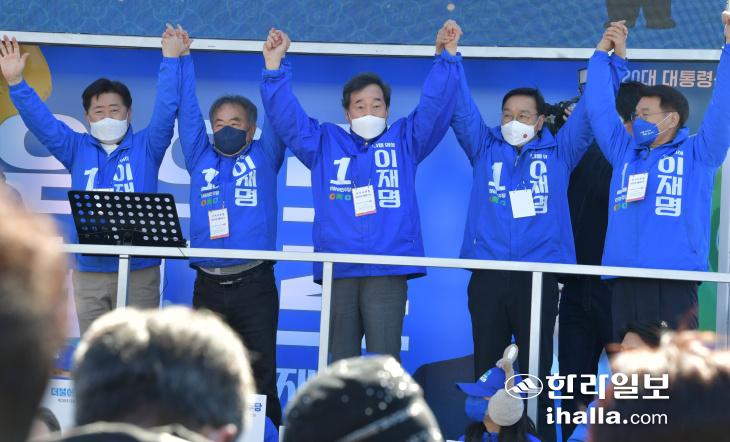 27일 더불어민주당 이낙연(왼쪽에서 세번째) 총괄선대위원장이 제주시 민속오일시장에서 이재명 대선 후보 지원 유세를 하고 있다. 강희만기자