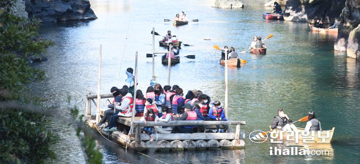 26일 서귀포시 쇠소깍을 찾은 관광객들이 전통테우와 나무카약을 타며 즐거운 시간을 보내고 있다. 이상국기자