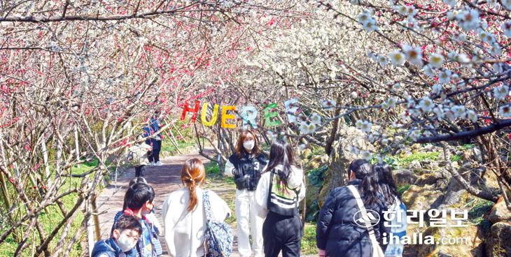 26일 서귀포시 휴애리자연생활공원 매화축제를 찾은 도민과 관광객들이 아름다운 매화꽃을 배경으로 기념 사진을 촬영하고 있다. 이상국기자