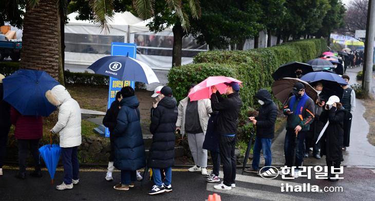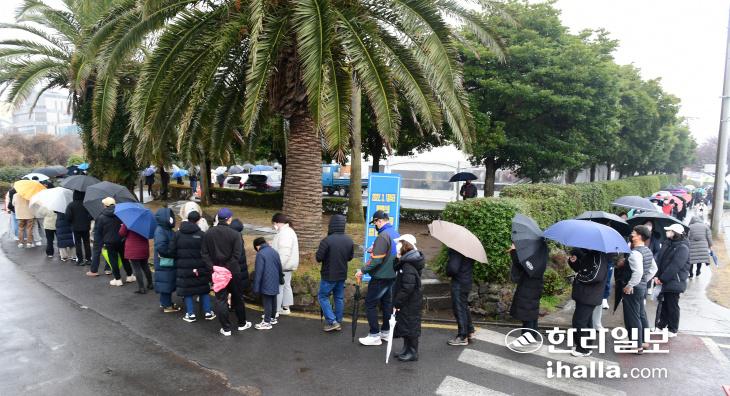 1일 제주보건소 선별진료소에는 비 날씨에도 코로나19 검사를 받으려는 시민들이 긴 행렬을 이루고 있다. 강희만기자