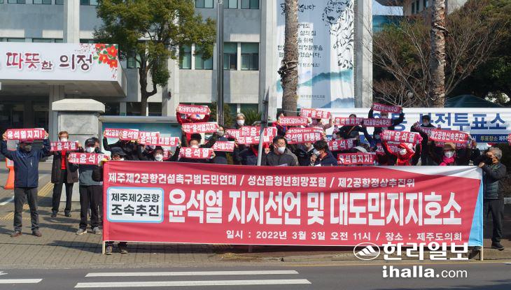 제주 제2공항 찬성 단체들이 3일 기자회견을 열고 국민의힘 윤석열 후보에 대한 지지를 선언했다. 김도영기자