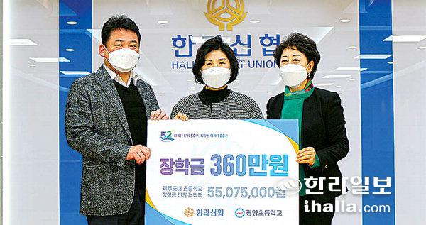 한라신협(이사장 김명옥)은 최근 제54차 조합원 정기총회에서 장학금기부를 결정하고 광양초등학교, 도남초등학교, 삼화초등학교, 아라초등학교에 각 360만원씩 장학금을 전달했다.