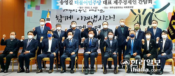 송영길 더불어민주당 대표가 4일 제주상공회의소에서 열린 도내 상공인과의 간담회에서 참석자들과 함께 화이팅을 하고 있다. 박세인 기자