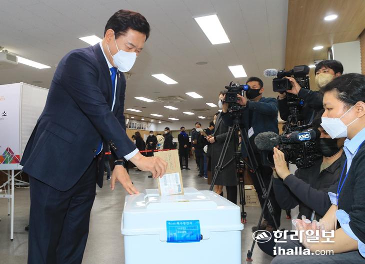 더불어민주당 송영길 대표가 4일 제주특별자치도의회 의원회관에 마련된 사전투표소에서 투표를 하고 있다. 강희만 기자