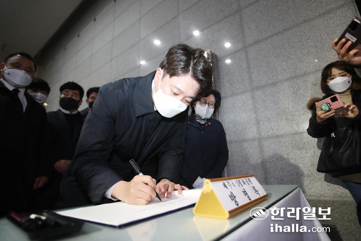더불어민주당 송영길 대표와 국민의힘 이준석 대표가 4일 잇따라 제주시 봉개동 4·3평화공원을 찾아 참배한 후 방명록을 작성하고 있다.
