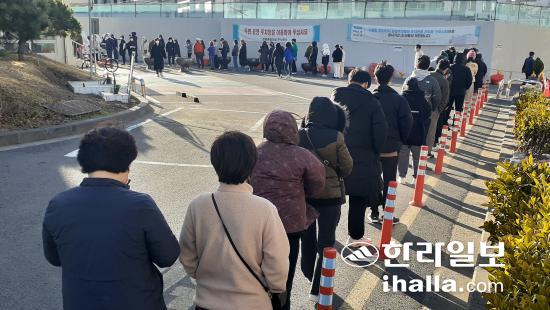 제20대 대통령선거 사전투표 2일차인 5일 오후 제주시 노형동사무소에 마련된 사전투표소에서 투표를 하려는 유권자들이 긴 줄을 서서 투표순서를 기다리고 있다. 강희만 기자
