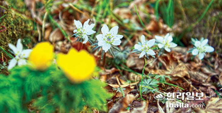 지난 5일 제주시 절물휴양림 인근 숲속에 터를 잡은 변산바람꽃이 만개해 봄을 알리고 있다. 강희만기자