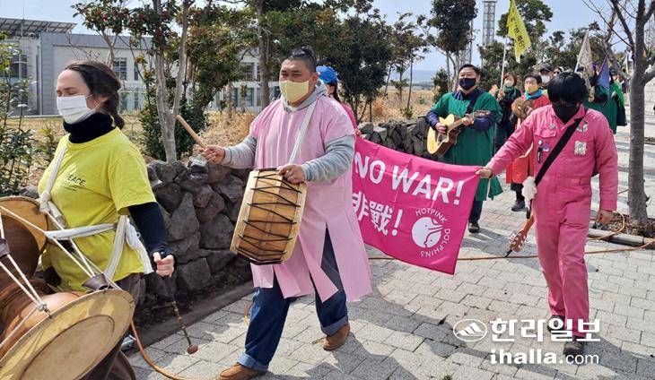 이들은 해군기지 일대 거리 곳곳에서 백배, 깃발·배너만들기, 리본메달기, 인간띠 문화제를 이어가며 "모든 전쟁은 멈춰야 한다"고 강조했다.