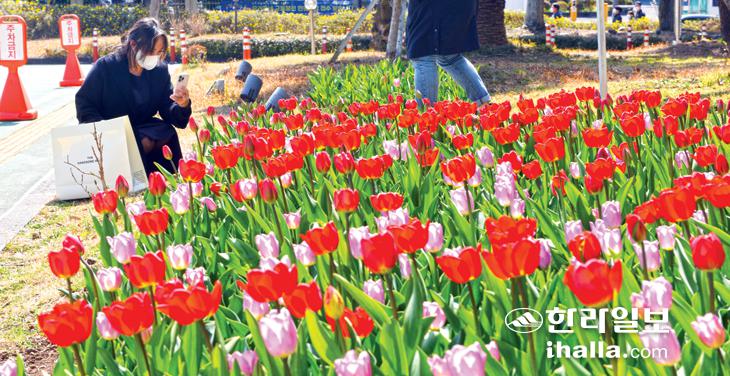 8일 제주도의회 정원에 아름다운 튤립이 만개해 지나가는 행인들의 시선을 사로잡고 있다. 이상국기자