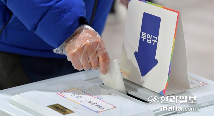 9일 오전 제주시 연동 제8투표소에서 한 시민이 코로나19 감염 예방을 위해 비닐장갑을 낀 손으로 투표용지를 넣고 있다. 강희만기자