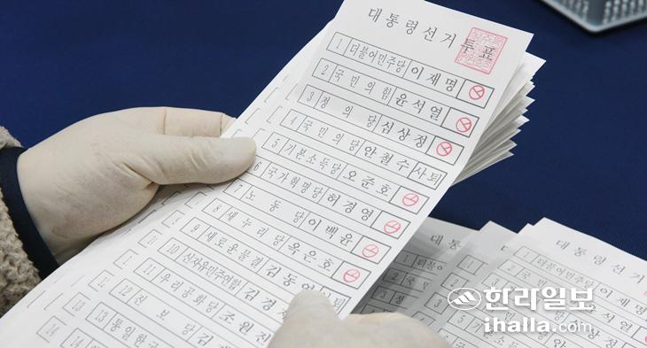 제20대 대통령 선거 개표소가 마련된 제주시 사라봉다목적체육관에서 발견된 무효표. 이상국기자