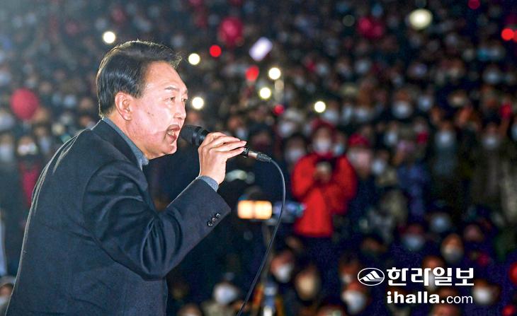 지난 8일 서울광장에서 마지막 유세를 하며 지지를 호소하고 있는 국민의힘 윤석열 당선인. 연합뉴스