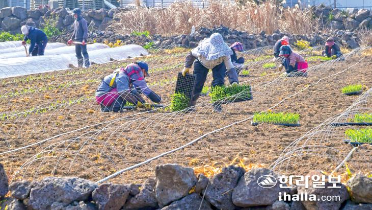 봄날씨를 보인 10일 제주시 도두동 한 농경지에서 농민들이 옥수수 모종 파종 작업을 하고 있다. 강희만기자